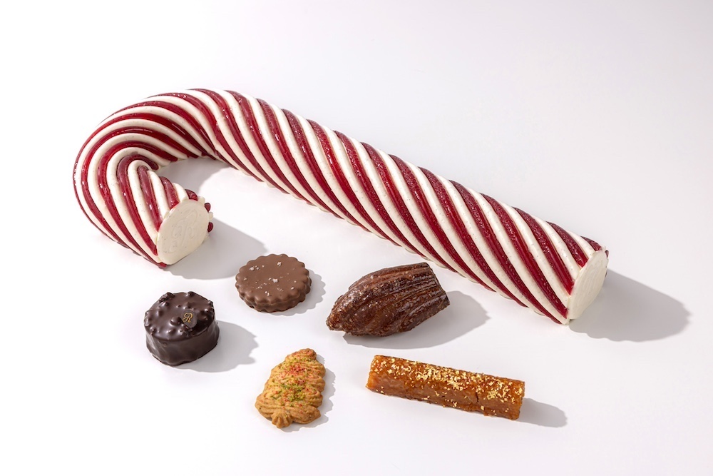 C’est un gros sucre d’orge torsadé en rouge et blanc comme les friandises accrochées au sapin. Un biscuit de savoie à la vanille de Papouasie grillée, et croustillant de mousse vanille d’Ouganda. Le décor, fait main, est une infusion de fleurs d’hibiscus subtilement fruitée. Édition limitée à 50 exemplaires numérotés, livrée dans un écrin coffre à jouets garni de 40 sablés. 8 à 10 pers : 250€. Et aussi, deux bûches paquet cadeau au riz au lait, spécialité du lieu et inventée par François Perret, longtemps chef pâtissier star du palace de la Place Vendôme. Il s’envole désormais vers d’autres aventures…IcI, une tablette de chocolat, posée sur un sablé speculos et garnie d’un riz au lait à la vanille de Madagascar et d’un crémeux speculos. Le tout intercalé de fines feuilles de chocolat au lait façon millefeuille, pour le croquant. Autre version coco-mangue. Prix : 95€, gâteau individuel : 18€. ritzparislecomptoir.com