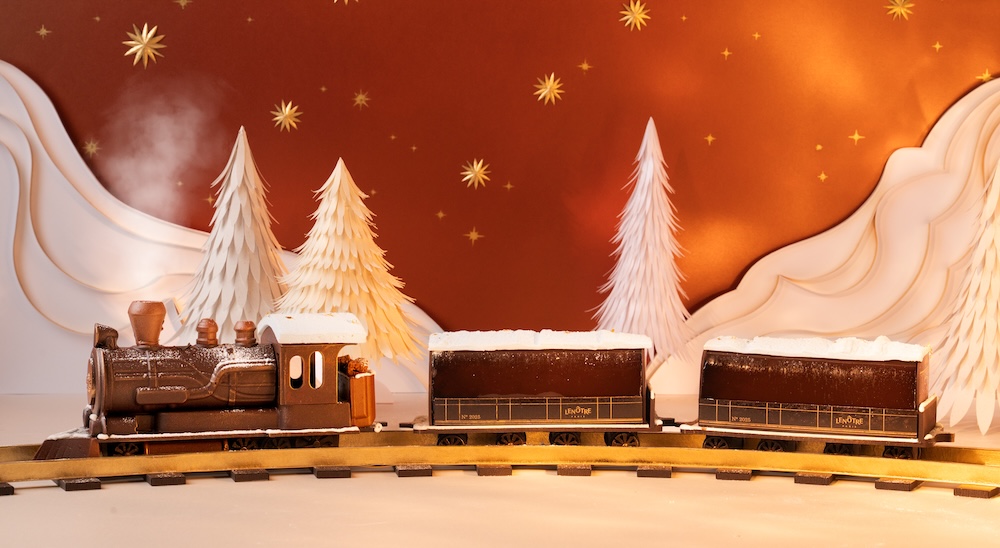 Embarquement immédiat sur la route de la gourmandise avec la maison Lenôtre. On prend le train pour un voyage aux pays des merveilles. Avec cette bûche signature, imaginée par Étienne Leroy, Champion du Monde de pâtisserie et chef pâtissier de la maison. Sous l’égide du chef Guy Krenzer, directeur de la Création Lenôtre. Tout y est : la locomotive tout chocolat, assemblage main de cinquante pièces. Wagons bûches, au croustillant noisette et grué de cacao, crémeux au praliné noisette, biscuit moelleux au cacao, crémeux au chocolat noir et lait praliné noisette. Touche gourmande ultime, les toits enneigés de guimauve et les finitions soulignées d’or. Avec un emballage artistique et savant, signé du Studio Marianne Guély, papesse du design de papier. 8/10 pers. : 190€ (2,9kg). Et bien sûr, la maison Lenôtre propose mille et une bûches : Bûche Haussmann, vanille et canelle, Bûche Riviera, agrumes et vanille, bûche Mont-Blanc, marron et vanille… lenotre.com